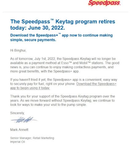 Got the email today from ESSO Speedpass. The Keytag program ends June 30, 2022. I start to use Speedpass Keytag in 2008. Already 14 years.