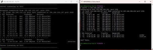 $ iperf3 -c 192.168.100.191 Connecting to host 192.168.100.191, port 5201 [ 4] local 192.168.100.147 port 8582 connected to 192.168.100.191 port 5201 [ ID] Interval Transfer Bandwidth [ 4] 0.00-1.00 sec 262 MBytes 2.20 Gbits/sec [ 4] 1.00-2.00 sec 280 MBytes 2.35 Gbits/sec [ 4] 2.00-3.00 sec 282 MBytes 2.37 Gbits/sec [ 4] 3.00-4.00 sec 280 MBytes 2.35 Gbits/sec [ 4] 4.00-5.00 sec 280 MBytes 2.35 Gbits/sec [ 4] 5.00-6.00 sec 281 MBytes 2.36 Gbits/sec [ 4] 6.00-7.00 sec 281 MBytes 2.36 Gbits/sec [ 4] 7.00-8.00 sec 235 MBytes 1.97 Gbits/sec [ 4] 8.00-9.00 sec 266 MBytes 2.23 Gbits/sec [ 4] 9.00-10.00 sec 280 MBytes 2.35 Gbits/sec - - - - - - - - - - - - - - - - - - - - - - - - - [ ID] Interval Transfer Bandwidth [ 4] 0.00-10.00 sec 2.66 GBytes 2.29 Gbits/sec sender [ 4] 0.00-10.00 sec 2.66 GBytes 2.29 Gbits/sec receiver iperf Done.
