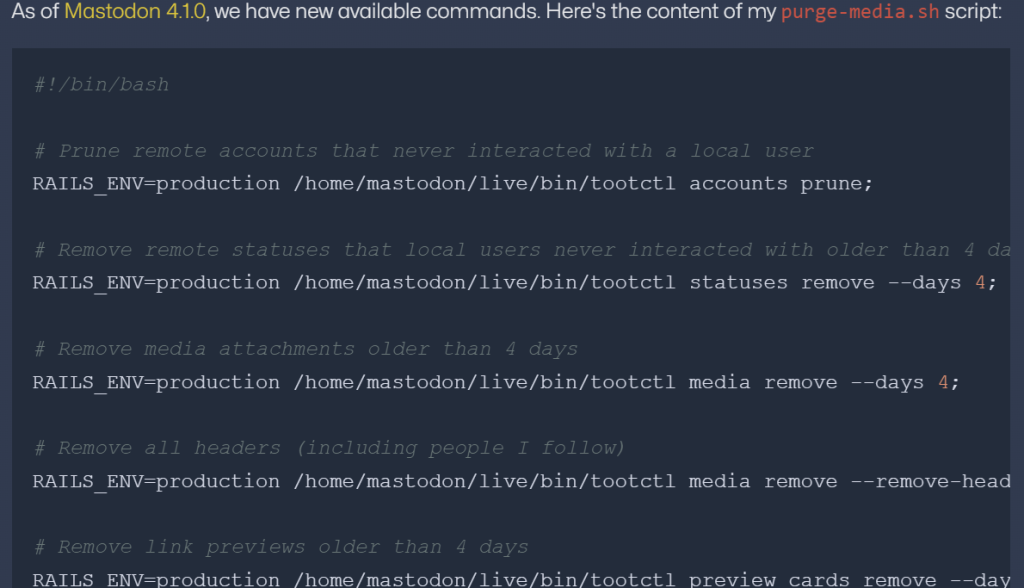 When I post the Mastodon Self-hosting – Clean Media Storage with tootctl command, I forget to record how I prepare the environment.