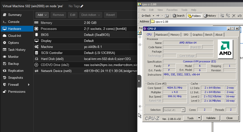 The CPU type I chose is KVM64 in the Proxmox VE host.