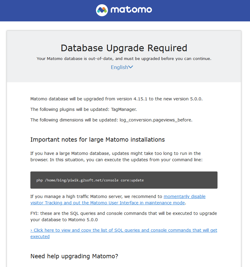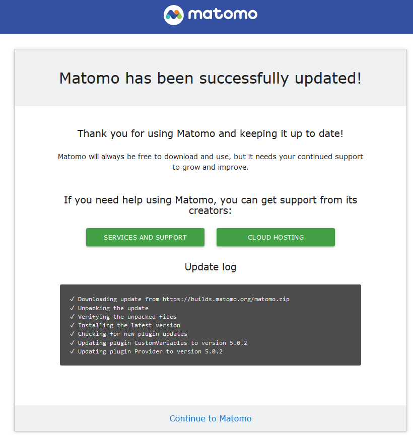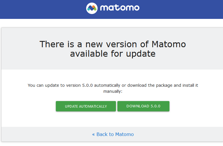 I can just click the button “NEW UPDATE: MATOMO 5.0.0”. It is promoted I can update it automatically.