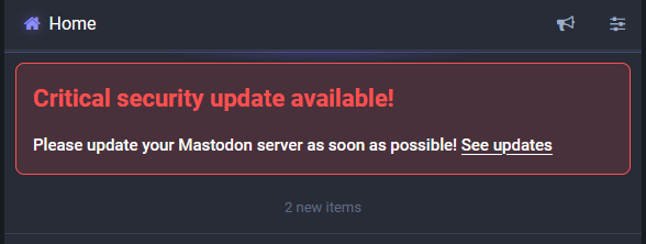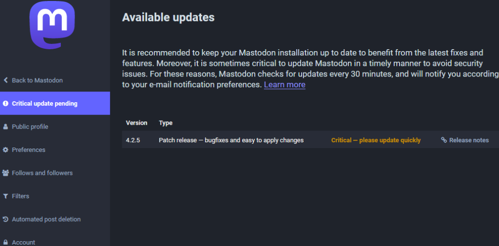 It is just a week since I upgraded my Mastodon from 4.2.3 to v4.2.4. Today, I saw this critical update notice when I checked the Maston instance this morning.