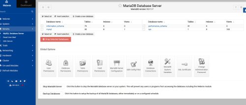 Go back to the Webmin panel and click the link “Refresh Modules”. Then check the Server / MySQL Database Server.