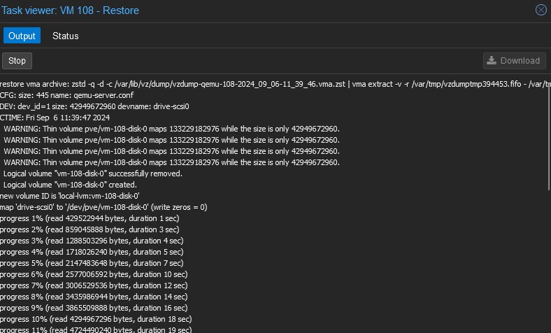 restore vma archive: zstd -q -d -c /var/lib/vz/dump/vzdump-qemu-108-2024_09_06-11_39_46.vma.zst | vma extract -v -r /var/tmp/vzdumptmp394453.fifo - /var/tmp/vzdumptmp394453 CFG: size: 445 name: qemu-server.conf DEV: dev_id=1 size: 42949672960 devname: drive-scsi0 CTIME: Fri Sep 6 11:39:47 2024 WARNING: Thin volume pve/vm-108-disk-0 maps 133229182976 while the size is only 42949672960. WARNING: Thin volume pve/vm-108-disk-0 maps 133229182976 while the size is only 42949672960. WARNING: Thin volume pve/vm-108-disk-0 maps 133229182976 while the size is only 42949672960. WARNING: Thin volume pve/vm-108-disk-0 maps 133229182976 while the size is only 42949672960. Logical volume "vm-108-disk-0" successfully removed. Logical volume "vm-108-disk-0" created. new volume ID is 'local-lvm:vm-108-disk-0' map 'drive-scsi0' to '/dev/pve/vm-108-disk-0' (write zeros = 0) progress 1% (read 429522944 bytes, duration 1 sec) progress 2% (read 859045888 bytes, duration 3 sec) progress 3% (read 1288503296 bytes, duration 4 sec) progress 4% (read 1718026240 bytes, duration 5 sec) progress 5% (read 2147483648 bytes, duration 7 sec) progress 6% (read 2577006592 bytes, duration 10 sec) progress 7% (read 3006529536 bytes, duration 12 sec) progress 8% (read 3435986944 bytes, duration 14 sec) progress 9% (read 3865509888 bytes, duration 16 sec) progress 10% (read 4294967296 bytes, duration 18 sec) progress 11% (read 4724490240 bytes, duration 19 sec) progress 12% (read 5154013184 bytes, duration 21 sec) progress 13% (read 5583470592 bytes, duration 23 sec) progress 14% (read 6012993536 bytes, duration 24 sec) progress 15% (read 6442450944 bytes, duration 27 sec) progress 16% (read 6871973888 bytes, duration 28 sec) progress 17% (read 7301496832 bytes, duration 30 sec) progress 18% (read 7730954240 bytes, duration 31 sec) progress 19% (read 8160477184 bytes, duration 33 sec) progress 20% (read 8589934592 bytes, duration 34 sec) progress 21% (read 9019457536 bytes, duration 37 sec) progress 22% (read 9448980480 bytes, duration 40 sec) progress 23% (read 9878437888 bytes, duration 43 sec) progress 24% (read 10307960832 bytes, duration 45 sec) progress 25% (read 10737418240 bytes, duration 49 sec) progress 26% (read 11166941184 bytes, duration 52 sec) progress 27% (read 11596464128 bytes, duration 55 sec) progress 28% (read 12025921536 bytes, duration 58 sec) progress 29% (read 12455444480 bytes, duration 61 sec) progress 30% (read 12884901888 bytes, duration 64 sec) progress 31% (read 13314424832 bytes, duration 66 sec) progress 32% (read 13743947776 bytes, duration 69 sec) progress 33% (read 14173405184 bytes, duration 72 sec) progress 34% (read 14602928128 bytes, duration 76 sec) progress 35% (read 15032385536 bytes, duration 79 sec) progress 36% (read 15461908480 bytes, duration 84 sec) progress 37% (read 15891431424 bytes, duration 87 sec) progress 38% (read 16320888832 bytes, duration 91 sec) progress 39% (read 16750411776 bytes, duration 95 sec) progress 40% (read 17179869184 bytes, duration 98 sec) progress 41% (read 17609392128 bytes, duration 101 sec) progress 42% (read 18038915072 bytes, duration 104 sec) progress 43% (read 18468372480 bytes, duration 107 sec) progress 44% (read 18897895424 bytes, duration 110 sec) progress 45% (read 19327352832 bytes, duration 112 sec) progress 46% (read 19756875776 bytes, duration 115 sec) progress 47% (read 20186398720 bytes, duration 118 sec) progress 48% (read 20615856128 bytes, duration 125 sec) progress 49% (read 21045379072 bytes, duration 129 sec) progress 50% (read 21474836480 bytes, duration 132 sec) progress 51% (read 21904359424 bytes, duration 134 sec) progress 52% (read 22333882368 bytes, duration 137 sec) progress 53% (read 22763339776 bytes, duration 139 sec) progress 54% (read 23192862720 bytes, duration 142 sec) progress 55% (read 23622320128 bytes, duration 145 sec) progress 56% (read 24051843072 bytes, duration 147 sec) progress 57% (read 24481366016 bytes, duration 151 sec) progress 58% (read 24910823424 bytes, duration 155 sec) progress 59% (read 25340346368 bytes, duration 159 sec) progress 60% (read 25769803776 bytes, duration 162 sec) progress 61% (read 26199326720 bytes, duration 165 sec) progress 62% (read 26628849664 bytes, duration 167 sec) progress 63% (read 27058307072 bytes, duration 170 sec) progress 64% (read 27487830016 bytes, duration 173 sec) progress 65% (read 27917287424 bytes, duration 176 sec) progress 66% (read 28346810368 bytes, duration 179 sec) progress 67% (read 28776333312 bytes, duration 183 sec) progress 68% (read 29205790720 bytes, duration 186 sec) progress 69% (read 29635313664 bytes, duration 189 sec) progress 70% (read 30064771072 bytes, duration 192 sec) progress 71% (read 30494294016 bytes, duration 195 sec) progress 72% (read 30923816960 bytes, duration 198 sec) progress 73% (read 31353274368 bytes, duration 201 sec) progress 74% (read 31782797312 bytes, duration 204 sec) progress 75% (read 32212254720 bytes, duration 207 sec) progress 76% (read 32641777664 bytes, duration 210 sec) progress 77% (read 33071300608 bytes, duration 213 sec) progress 78% (read 33500758016 bytes, duration 216 sec) progress 79% (read 33930280960 bytes, duration 219 sec) progress 80% (read 34359738368 bytes, duration 221 sec) progress 81% (read 34789261312 bytes, duration 224 sec) progress 82% (read 35218784256 bytes, duration 227 sec) progress 83% (read 35648241664 bytes, duration 232 sec) progress 84% (read 36077764608 bytes, duration 236 sec) progress 85% (read 36507222016 bytes, duration 240 sec) progress 86% (read 36936744960 bytes, duration 243 sec) progress 87% (read 37366267904 bytes, duration 246 sec) progress 88% (read 37795725312 bytes, duration 248 sec) progress 89% (read 38225248256 bytes, duration 251 sec) progress 90% (read 38654705664 bytes, duration 254 sec) progress 91% (read 39084228608 bytes, duration 256 sec) progress 92% (read 39513751552 bytes, duration 259 sec) progress 93% (read 39943208960 bytes, duration 267 sec) prog