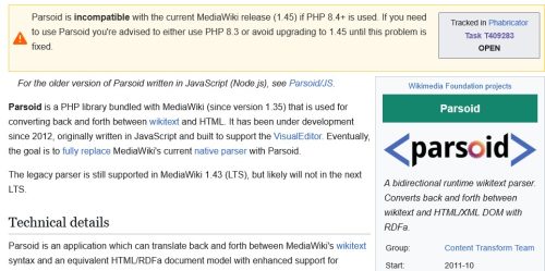 Parsoid is incompatible with the current MediaWiki release (1.45) if PHP 8.4+ is used. If you need to use Parsoid you’re advised to either use PHP 8.3 or avoid upgrading to 1.45 until this problem is fixed.